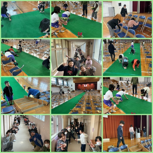 卒業式の予行練習がありました。これまで練習してきた呼びかけや合唱を、しっかりと出すことができていました。明日はいよいよ卒業式本番です!6年生を最高の形で送り出しましょう。また、掃除と昼休みを使って式場の最終準備をしました。どの児童も6年生のために、一生懸命式場の準備を頑張りました。