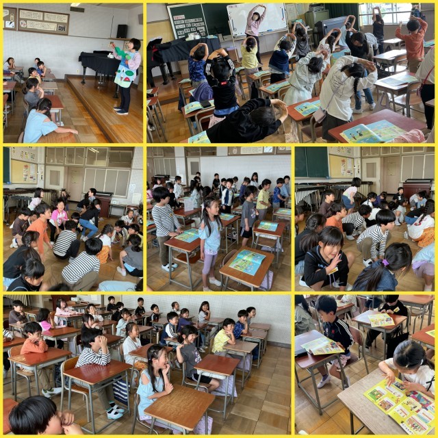 先生の人形劇を楽しんだ後、教科書を読み、歌を歌うときの姿勢を教えてもらいました。