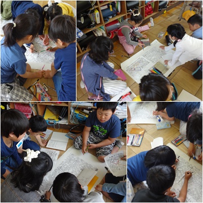 3回の扶桑東小周辺の探検、屋上からの扶桑町の様子を班で大きな地図にまとめています。班で協力しててきぱきとまとめている班が多かったです。