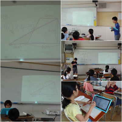 文字式のまとめとして、台形の面積が(a+6)×4÷2 になるのかを考えました。考えたことをタブレットを使ってみんなに説明しました。
