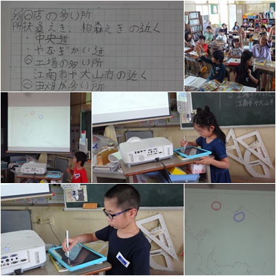 また、タブレットを使って、愛知県が日本のどこら辺なのか、扶桑町は、愛知県のどのくらいの場所にあるのか、それぞれの考えを印し、スクリーンに映しました。