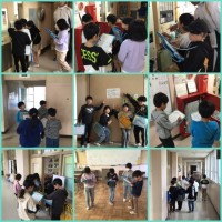 算数は、校庭の横の長さを元に、3階の廊下の長さを予想し測定しました。そのほかにも、教室のロッカーや図工室の机などの長さを測りました。