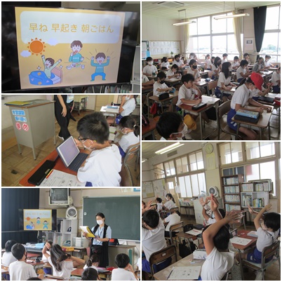 身長や体重を計測後、「早寝・早起き・朝ご飯」の話を聞きました。