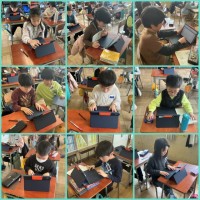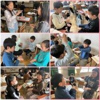 3年生の教室前では、待ち時間を利用して児童が作ったことわざ辞典、活動の記録のスライドをご覧いただけます。