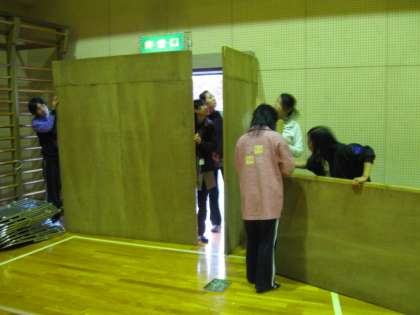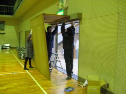 昨日25日,子供たちが下校した後の作業の様子です。体育館入り口に暗幕付きの特別な出入り口を設置しました。年に一度のことなので,1年前のことを思い出しながら試行錯誤で作業を進めました。