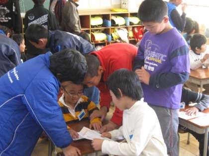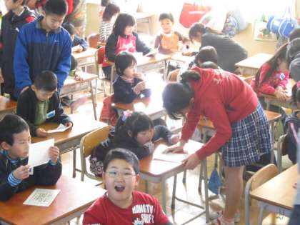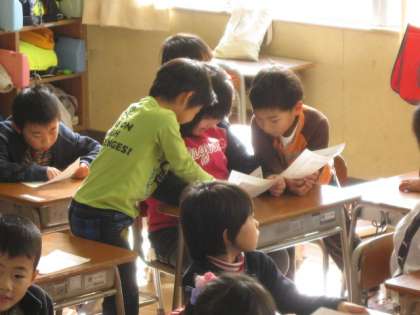 6年生のお兄さんお姉さんが1年生の子供たち一人ひとりに,学芸会の感想を手渡しました。1年生の子供たちは,その言葉に食い入るように読んでいました。