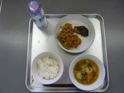 ごはん さばの塩焼き れんこんのきんぴら ちゃんこ汁