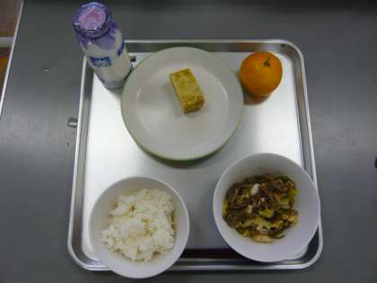 ごはん すき焼き 厚焼き卵 みかん 牛乳