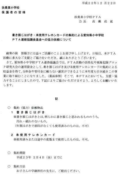 PTAの呼びかけにより,書き損じはがき・未使用テレホンカードを集めることになりました。各家庭へは,児童を通して下のプリントを配付しました。地域の皆様におかれましても,ご協力をいただければ幸いです。