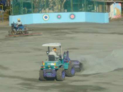 運動場の表面をならし,グリーンサーフェイスを敷きなおしました。1日がかりの作業です。