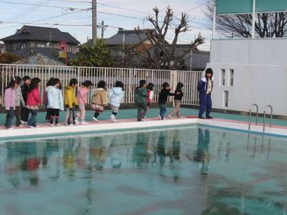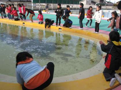 今日の朝,校内で気温を測ったところ,冷蔵庫(6度)よりも冷たい気温(5度)になっていました。夜明けあたりの最低気温は−3度だったそうです。プールの水が凍りました。1年生では,プールサイドに出て,氷の冷たい感触を楽しみました。