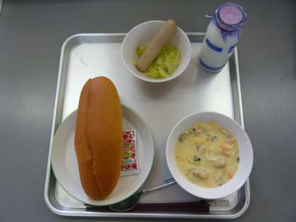 ホットドッグ(フランクフルト・キャベツ) コーンチャウダー 牛乳