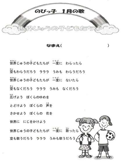 今月の歌は「世界じゅうの子どもたちが」です。毎朝,朝の会などで,子どもたちが元気な歌声を響かせています。