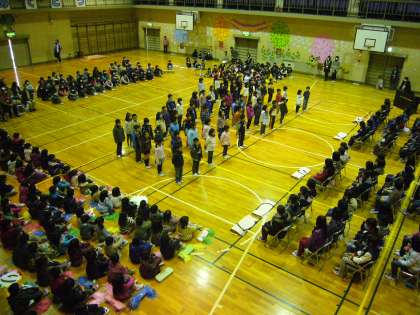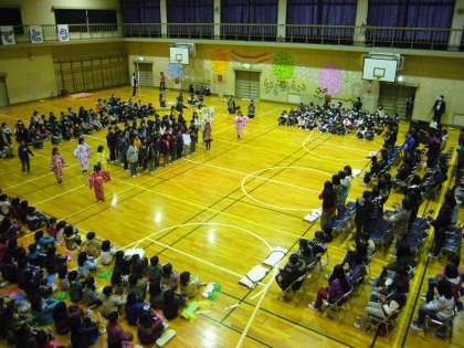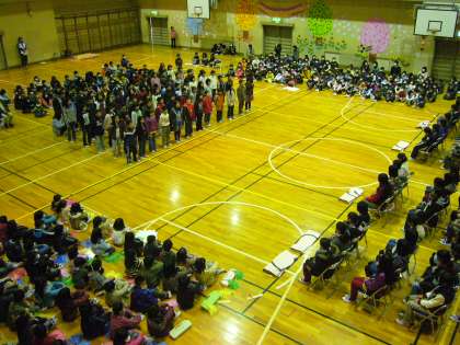 4年(写真上),2年(写真中),3年(写真下),1年,5年の順に各学年が,合唱を中心とした贈り物(出し物)に工夫を加えてプレゼントしました。