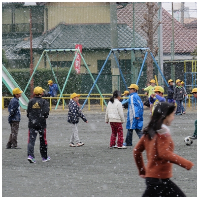 今日の昼頃から雪がちらつき始めました。掃除が終われば,楽しい昼放課。子どもたちは運動場で元気よくサッカーやバスケ,鬼ごっこなどをしています。もちろん,放課の終わりを知らせる音楽が流れたら,遊ぶのやめ,手洗いうがいをして5時間目の授業に向かいます。