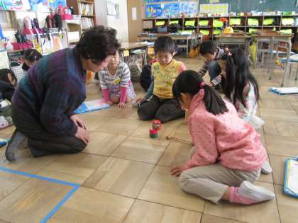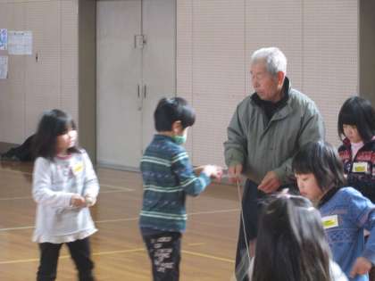 体験した遊びは、おはじき・お手玉・だるまおとし・あやとり・竹とんぼ・こま・けん玉・はねつきの8種類です。