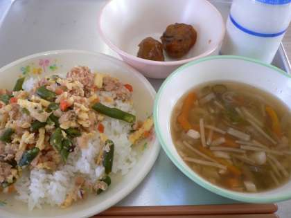 主食:ごはん 主菜:豆腐だんご 副菜:ちらしずしの具 さわにわん 牛乳