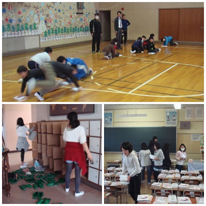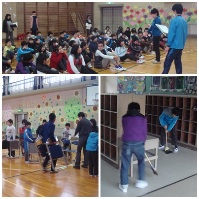 体育館、1年生の教室、下駄箱や廊下などに分かれて、準備とそうじをしてくれました。