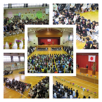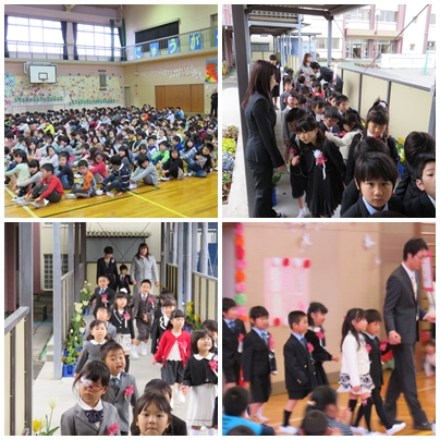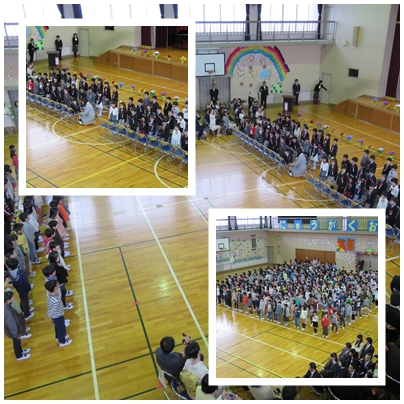 本日、男女合わせて64名の児童が本校に入学しました。2年生から6年生の在校生が拍手とともに新入生を温かく迎えてくれました。これも,本校のよき伝統です。最初は緊張していた新入生も,安心して式に参加することができました。