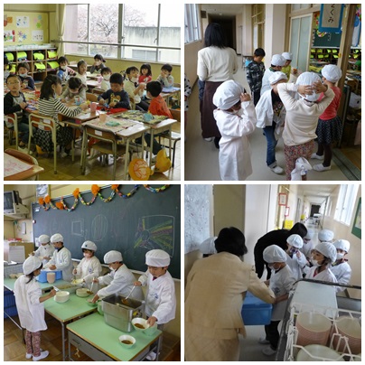 小学校では自分たちで給食の準備をしなければなりませんが、担任の先生と支援員の先生の話を聞いて、上手に準備をすることができました。