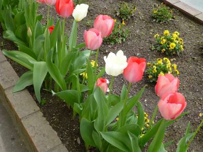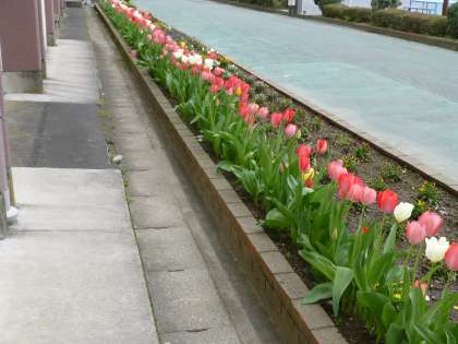 校舎の裏の花壇に、横1列に並んだチューリップの花たち。数がたくさんだけあって、爽快な感じがします。