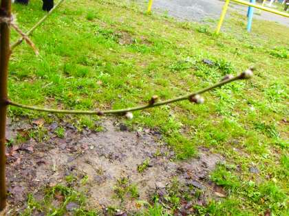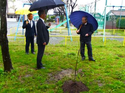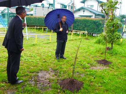 先日、4年生が苗を植えたハナモモの木を教育長先生が視察にみえました。