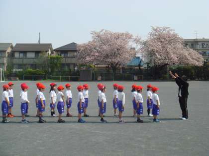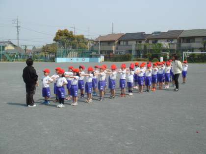 体育の時間に1年生が運動場で、集団行動の練習をしていました。