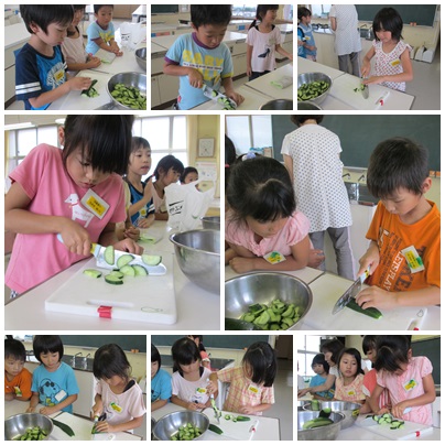 昨日、学年の畑で育てていたきゅうりを収穫し、調理経験のある子を募って、きゅうりの塩もみを作りました。