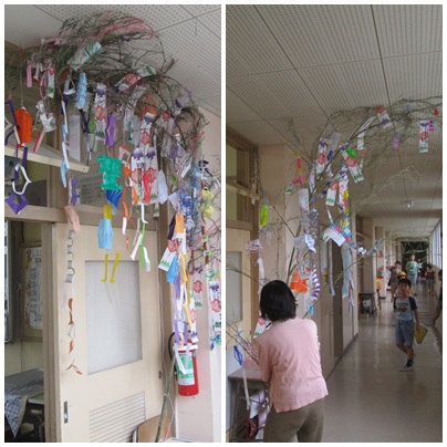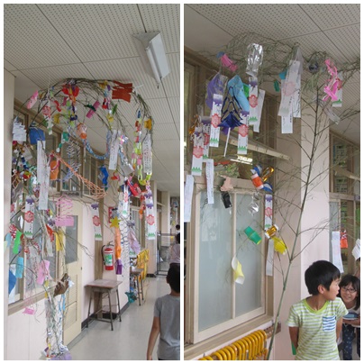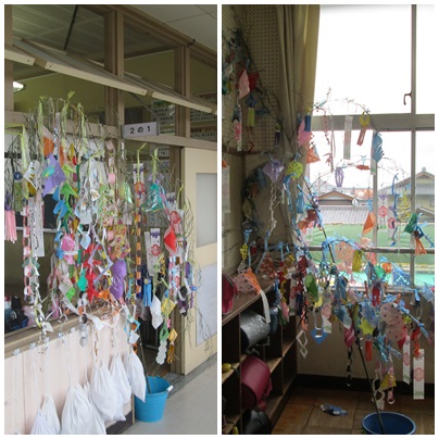 七夕集会で飾る「七夕飾り」がそれぞれのクラスで完成して、廊下を飾っていました。