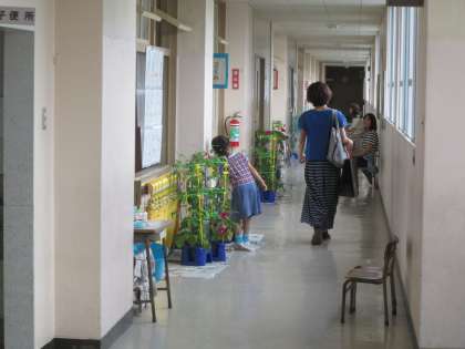 1年生の廊下には、持って帰ってもらうアサガオの鉢植えが、置いてありました。
