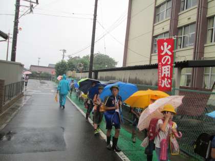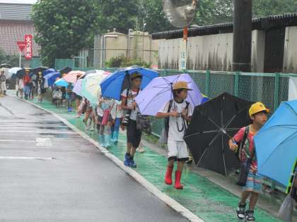 みんなかさをさして、1列に並んで登校してきました。