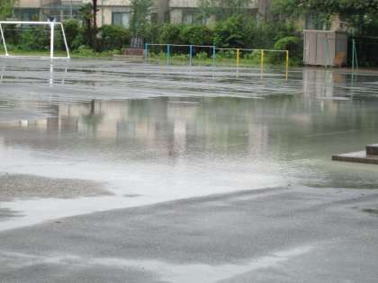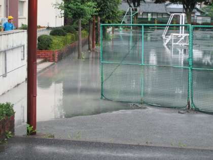 学校でも、雨がグランドのふちにたまり、池のような状態になりました。