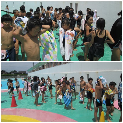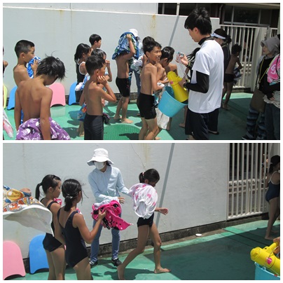 水泳終了時間になると、バスタオルでふき、先生のチェックを受けてから更衣室にむかいます。