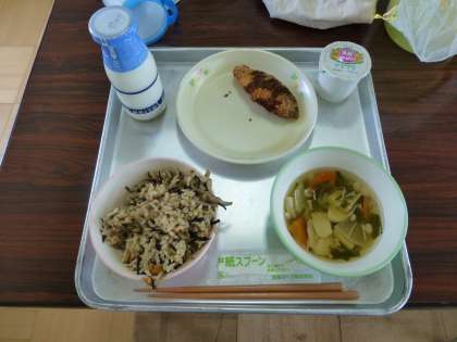 五目ひじきごはん、サーモンフライ、牛乳