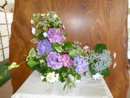 学校の玄関にアジサイが飾られています。 一服の清涼剤のように。