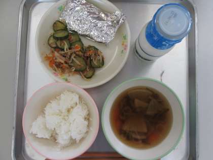 ごはん さばの銀紙焼き 牛乳 土佐あえ けんちん汁
