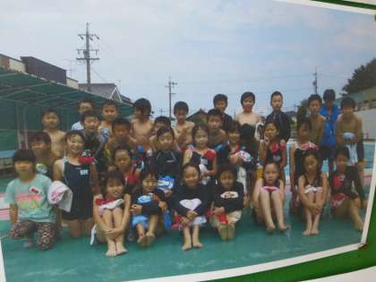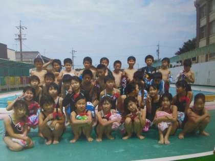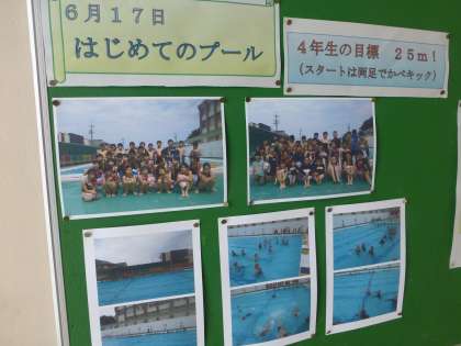 4年生掲示板に、初めてのプール時の写真が貼ってありました。