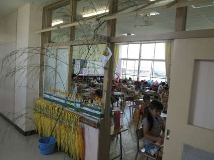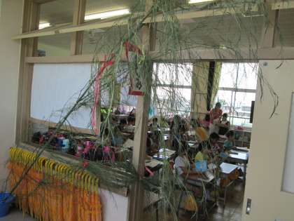 廊下に笹の葉がゆらめいて、そのなかでの勉強です。