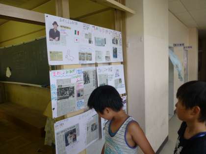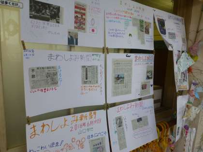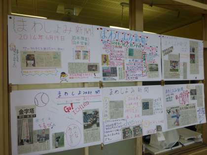 4年生の廊下に、ファミリー学級で作成した「まわし読み新聞」が飾られていました。