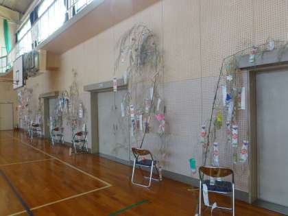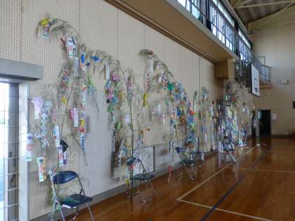 体育館の方に、七夕かざりがきれいに並べられました。