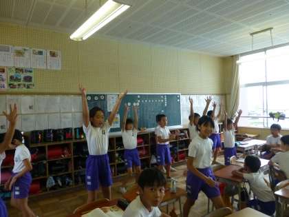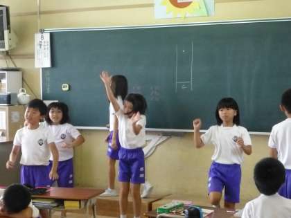 4年生が教室で、運動会で踊るダンスを踊っていました。