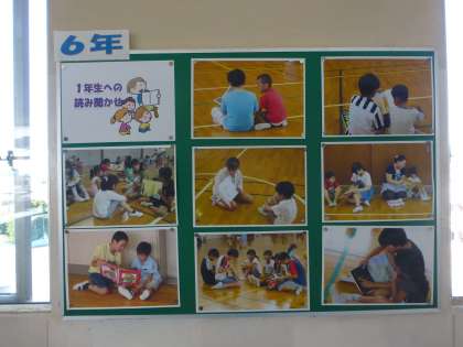 6年生の廊下に、ペア読書の写真が貼ってあります。 ぼのぼのとしたいい雰囲気です。
