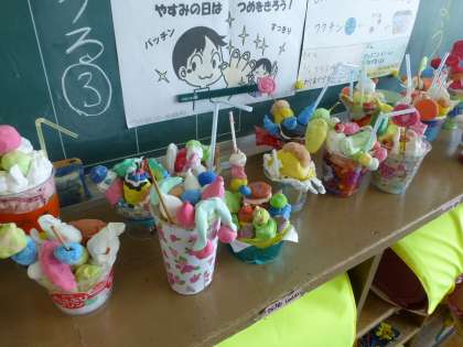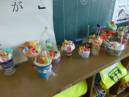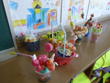 1年生の図工、「デザートをつくろう」の作品が飾ってありました。