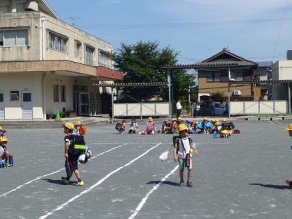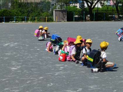 先に運動場に出た人たちは、はやく座って待っています。