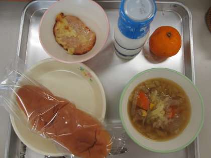 愛知の米粉パン ハムのチーズ焼き 牛乳 ミートボールのスープ煮 冷凍みかん