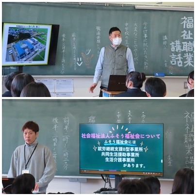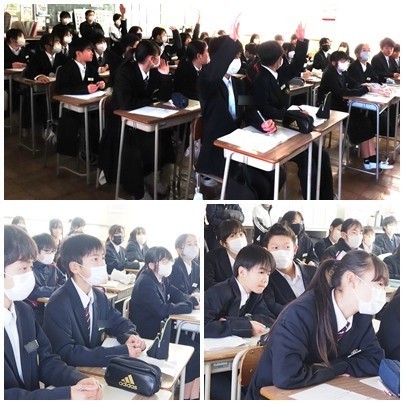 福祉分野で活躍されている方をお招きし、「今の職業に就いたきっかけ」「大変なことややりがい」「中学校生活とのつながり」などについてお話を聞きました。1年生の今はまだ具体的にどんな夢があるか決まっている人はまれかもしれませんが、「好きなことをとことんやること(夢が見つかるかもしれない)」「勉強をすること(道が広がる)」を一生懸命にやろうというメッセージをいただいたりしました。進路決定や職場体験はまだ先ですが、今日をきっかけに少しずつ行動にうつしていけるといいですね。講師の先生方、寒い中来校いただきありがとうございました。