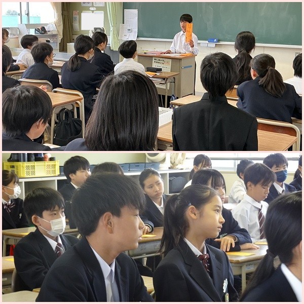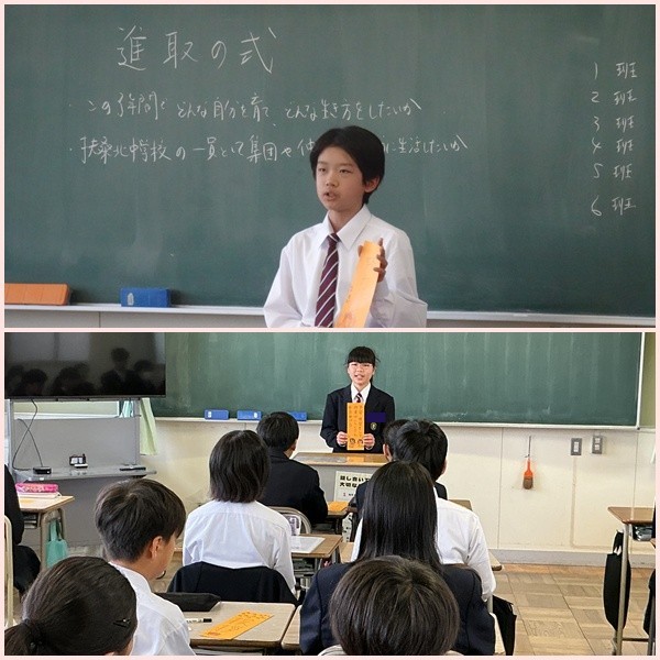 本日は進取の式が行われ、自身が中学校生活で3年間頑張りたいこと、心がけたいことを考えて、クラスの仲間の前で発表をしました。