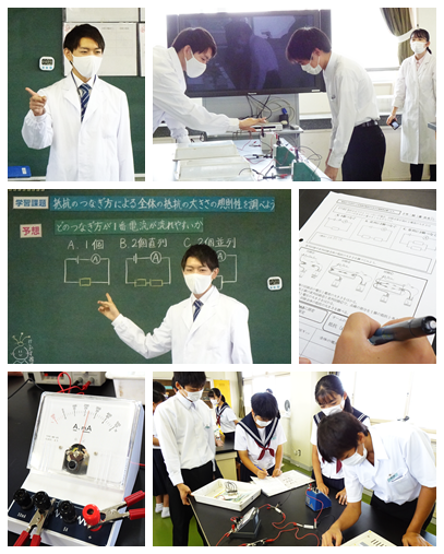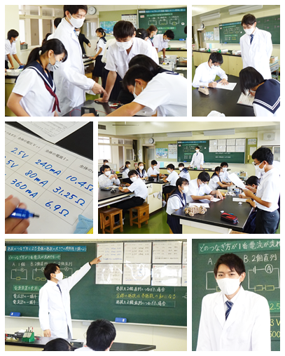 電気についての学習で、抵抗の数やつなぎ方によって、抵抗の大きさがどのように変わるのかを、実験を通して見つけていきます。有名なオーム法則に関する授業です。田中先生は、回路見本などを提示しながらわかりやすく説明され、生徒のみなさんも班で協力し、実験をスムーズに進めることができました。その結果、直列と並列による抵抗値の違いを見いだすことができました。電気の直列・並列やオームの法則は、受験でもよく出題される内容です。しっかり理解できるように学習に取り組んでいきましょう。