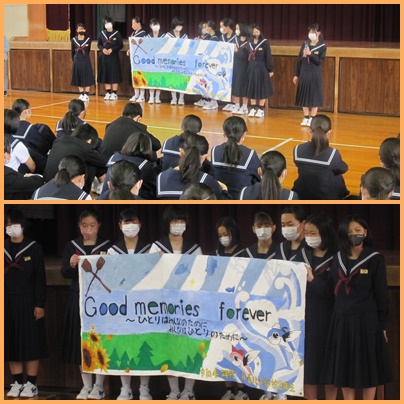 集会の中で、「整列隊形の確認」と「自然教室の横断幕の披露」の2点を行いました。