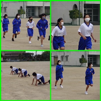 準備運動でのランニングのコースを確認したり、短距離走のクラウチングスタートの練習をしたりしました。